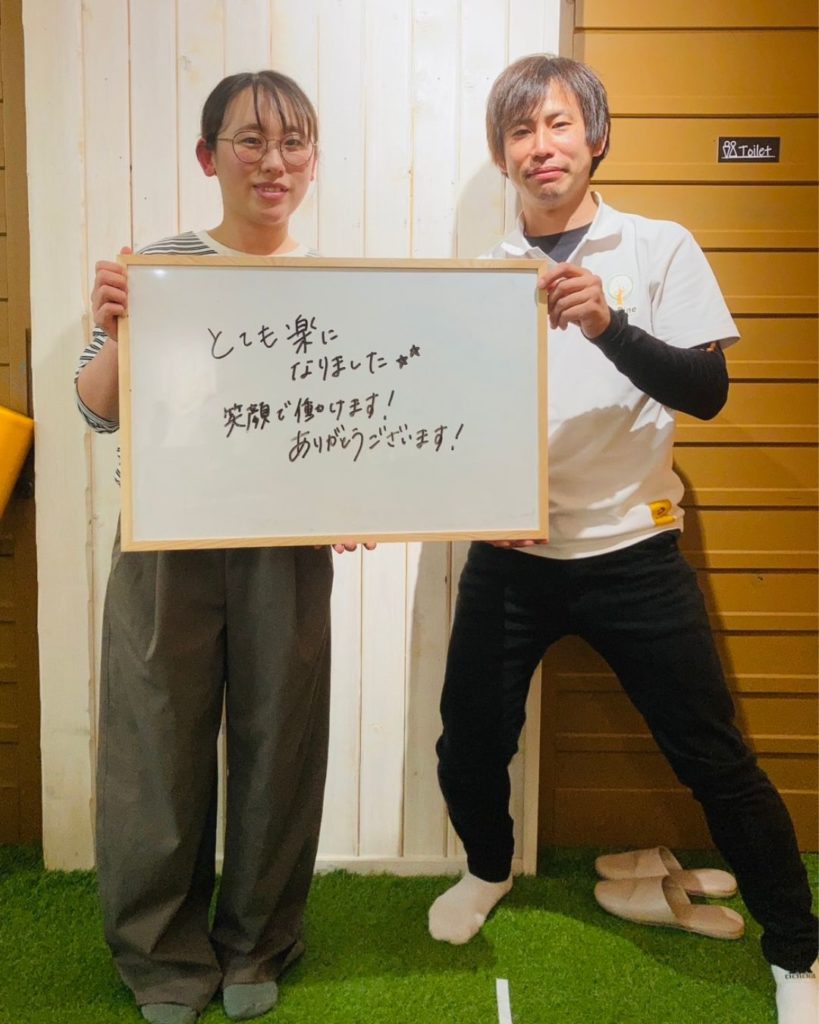 腰痛が日々良くなり、痛みが減った。反り腰もほぼなくなった。施術してもらうと全体がスッキリして1週間頑張れます。