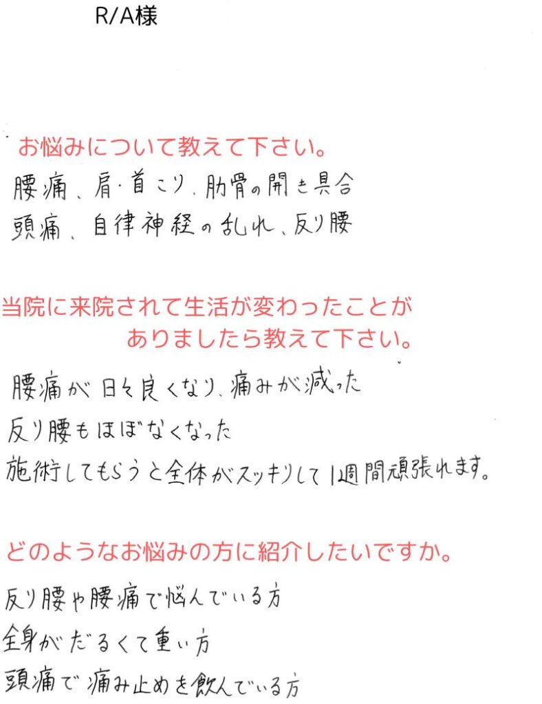 腰痛が日々良くなり、痛みが減った。反り腰もほぼなくなった。施術してもらうと全体がスッキリして1週間頑張れます。